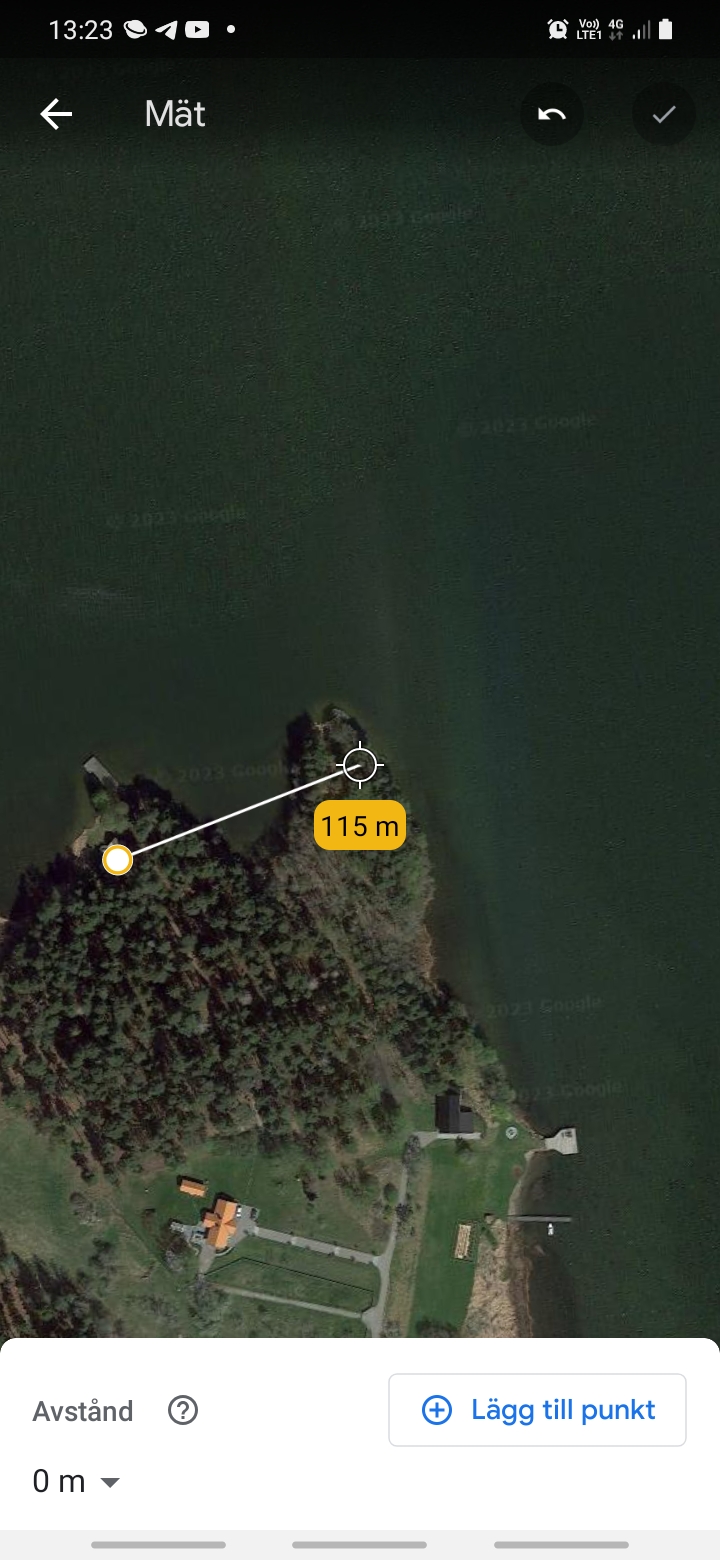 Nu när jag tittar på Google earth ser jag att det är 115 meter till närmsta hus och att det ligger 2 skogsdungar mellan mitt tält och huset.