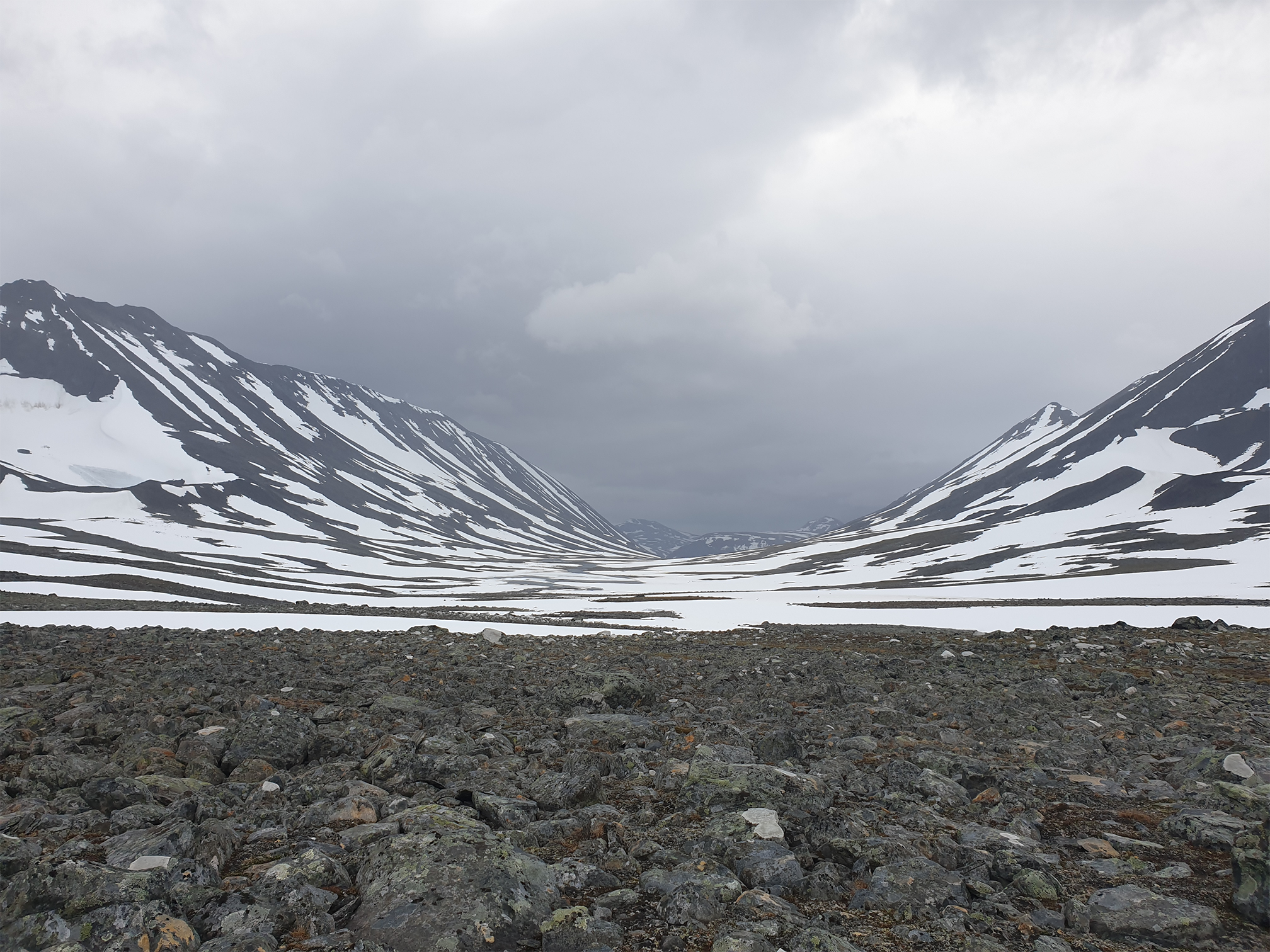 Det är riktigt mkt sten mellan Kaskasavagge och Kuopervagge men inte svårt. Nedgången till Tarfala varnas det för numera. Troligen enklare att gå åt andra hållet.