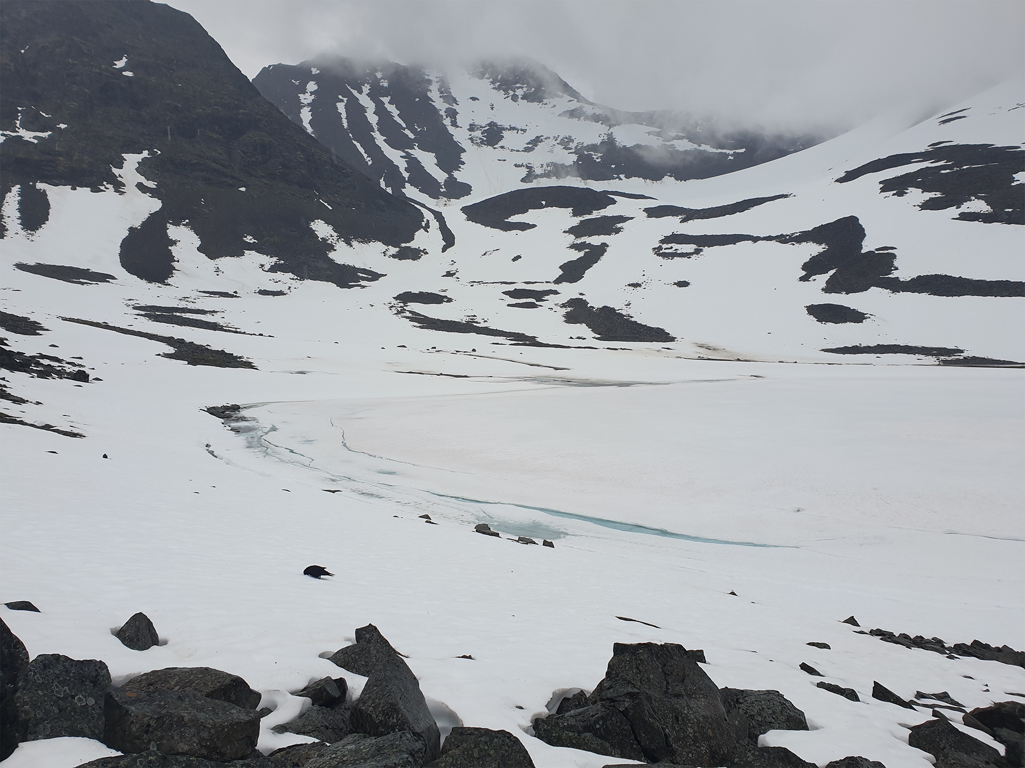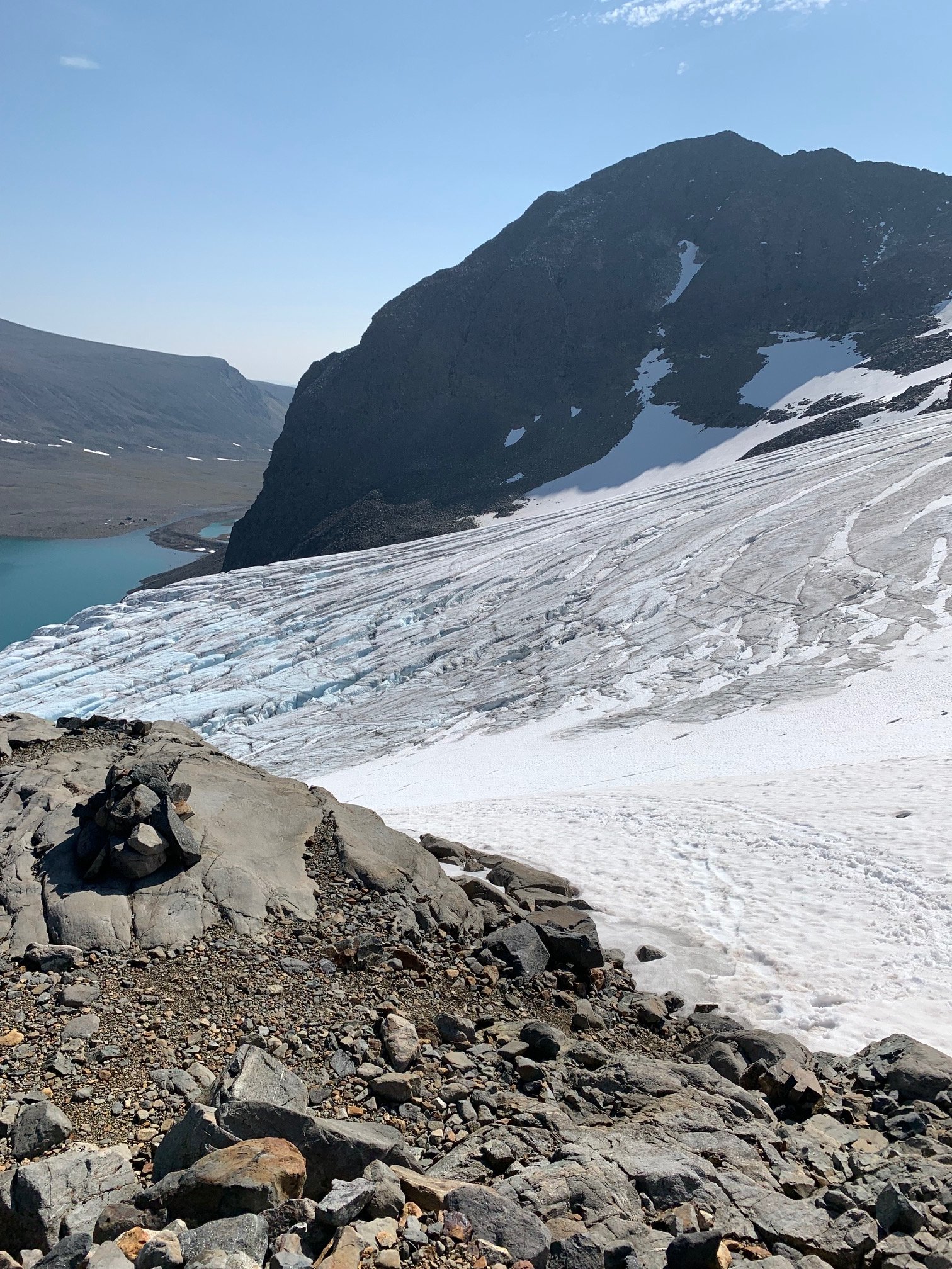 Bild från 6 augusti då jag och tre andra passerade glaciären på väg mot Tarfala. Det var då ganska lite snö kvar på glaciären och randsprickan mot klippan vid leden var någon decimeter bred. Tre av oss gick ca 100 meter på snö/glaciärä medan jag klättrade på klippan. Jag fick hålla i minnesskylt för att finns grep vid ett tillfälle. Det känns osäkert både med snö/glaciär-passagen samt klättring.