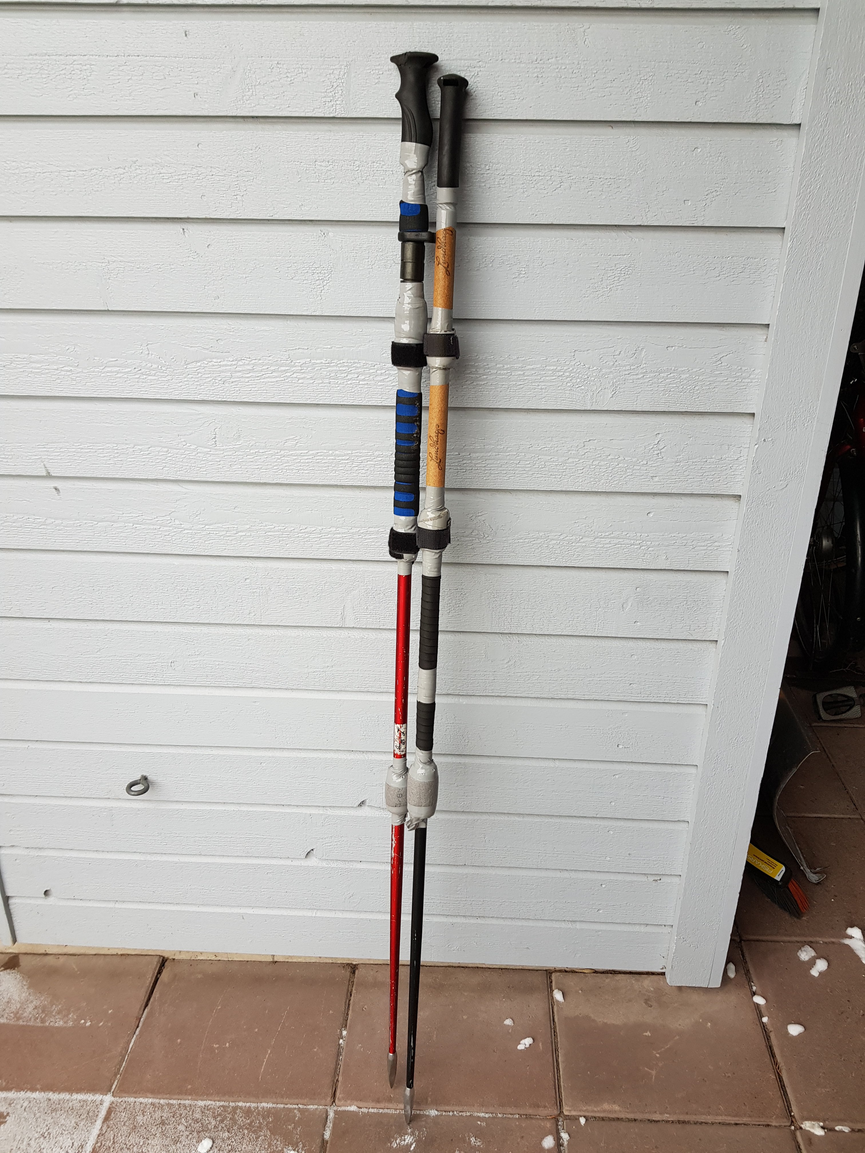 Äsch, tummen ner för mitt hemmafixade fäste efter dagens skridskotur. Precis så lite för bökigt för att det ska kännas enklare att strunta i hopkopplingen. Och vill man pika med stavarna hopkopplade, får man vara noga att verkligen hålla i bägge, håller man fel så bryts den ganska klena kopplingen troligen av.