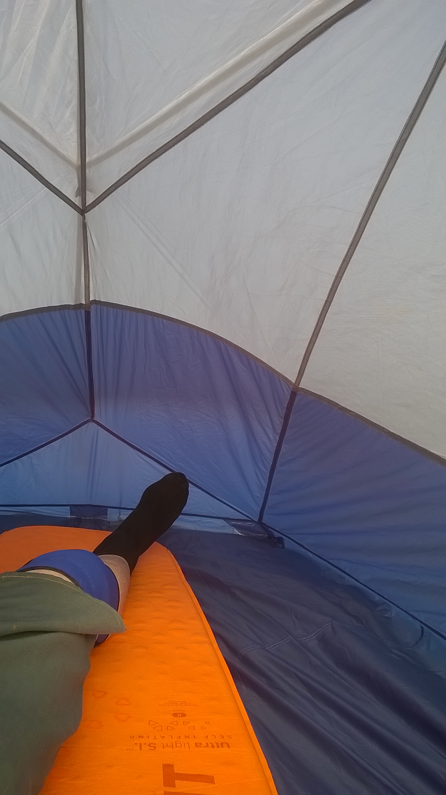 Det jag direkt märkte är att det är tyvärr liiiiiite kort och sluttande fotändeinnertält, så risk att sovsäcken kommer emot tältduken. Nåja, man kan inte få allt