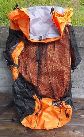 Ryggsäcken är på 65 liter, den kan enligt producenten packa upp till 13,5 kg utan problem. Den är orange på fronten och ljusgrå på ryggen. Frontfickan och de nedre sidofickorna är fastsydda, medan de över sidofickorna och axelremsfickan är löstagbara. Jag tänker beställa en till ficka till den andra axelremmen så jag kan lägga solglasögonen i den ena och ha myggmedel och solskyddsfaktor i den andra. Nu har jag bara plats för en av dessa i den enda fickan jag har.