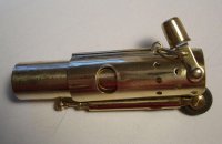 Gjord i mässing, igen...:), i änden med fästringen som man skruvar loss så fyller man på bensin, den rymmer mycket vilket är bra, lock som man skjuter bort genom att dra ytterhöljet uppåt, bra då locket håller veken fuktig av bensin, på sidan en gnist-tändare som rymmer flera stift på rad, bra för lång störningsfri tändning utan byte av stift så ofta, "gnisthjulet, rejält tilltaget, ordentligt fastsatt o stor diameter på, bra för att lätt kunna snurra fram ordentliga gnistor lätt, andra tändare brukar ha små hjul som kärvar, fastnar.
