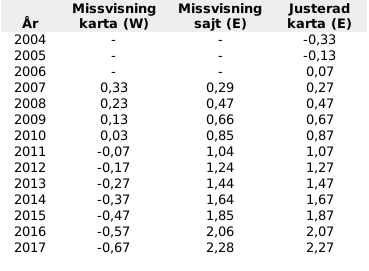 Uppenbart är det nåt vajsing. Årlig ändring av missvisning tycks nära 0,2° enligt sajten som förresten använder öst som positiv riktning. Justerar man den vänstra kolumnen enligt detta och dessutom ändrar positiv riktning från väst till öst får man den högra kolumnen. Förskjuter man sedan värdena ser man att kartans angivna missvisning var aktuell redan nångång 2004. 0,33° västlig är -0,33° östlig.