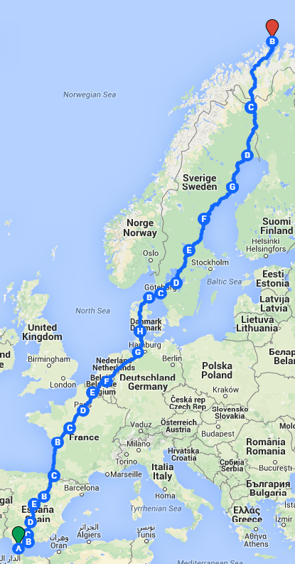Den preliminära rutten är: Tarifa - Gibraltar - Madrid - Bordeaux - Paris - Bruxelles - Enschede - Hamburg - Ribe - Fredrikshamn - Gothenburg - Mariestad - Hudiksvall - Töre - Palojensuu - Kautokeino - Alta - North Cape.