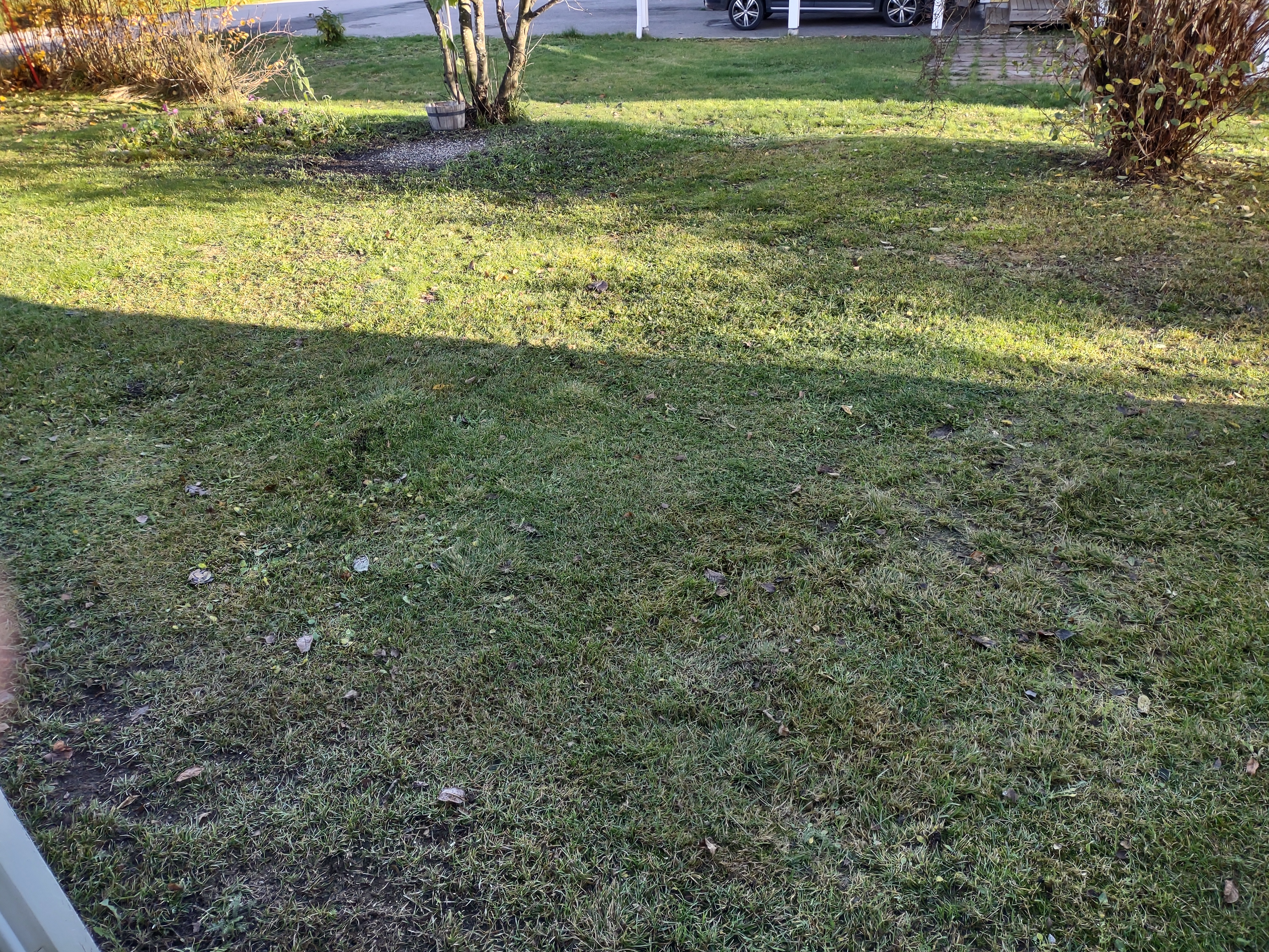 Vi hade en rejäl tjälbränna el. vad jag skalla det på gräsmattan i försommaren och under hela sommaren men vad det gula är för en konstig växt som har kommit nu under hösten vet jag inte. Jag har inte fuskat! Bara så att ni vet det!:) Något förslag?