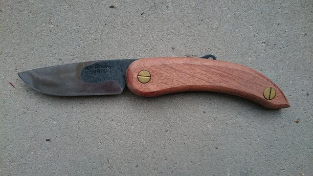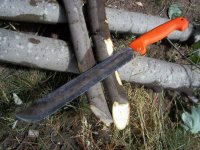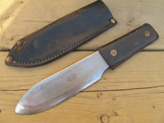 Jag har precis samma kniv, dock köpt från USA. Vass som få direkt ur förpackningen var den också. Tyvärr är den ju som du beskriver alldeles för stor och tung för att den ska gå ha med sig, har man den i bältet en hel dag lär man vara sned i ryggen sen. Skulle ha kollat upp måtten närmare innan jag beställde 😀. Det finns även en mindre version av den som verkar vara mer hanterbar, får se om jag ska beställa den så småningom. Gillar verkligen utseendet på dessa knivar!Och här kommer ytterligare en huggare – som avgjort väger för mycket för att släpa runt på. Tror den hamnar på närmare kilot med slidan. Elva tums blad. Men det är fin kvalitet, köpt på ort och ställe i Nya Zeeland, stålet är svenskt vill jag minnas.