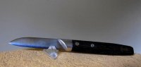 Bladet är bara 75 mm långt men skaftet är i "full size", dvs ca 115 mm med främre back i förnicklad mässing (gissar jag) så att balansen flyttas framåt. M a o i det närmaste perfektion när det gäller ergo.