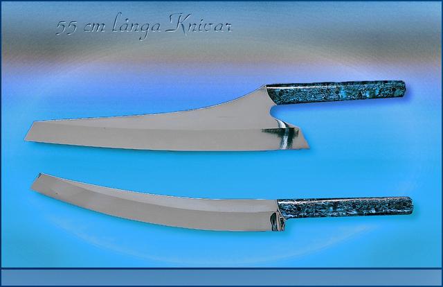 Om du vill vara "Kung i Köket" skulle nog någon av dessa passa. De finns i tre längder och två olika sorters stål, 35, 45, och 55 cm längd. Handtagen naturell och betsad Masurbjörk. Bilden visar ett exempel på att föra in lite färg i Köket. // bbmojje