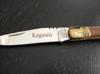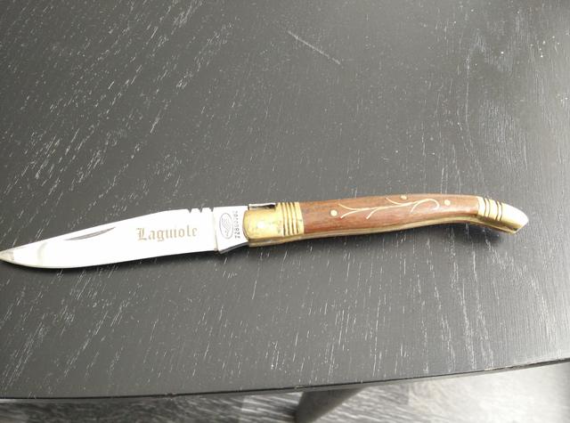 Var på loppis idag och hittade en kniv med medföljande bryne. Har googlat lite och hittar ingen Laguiole med sådan logga på bladet så jag misstänker att den kan vara "fejk" (har läst att det inte finns några direkta regler för att använda namnet därav "").