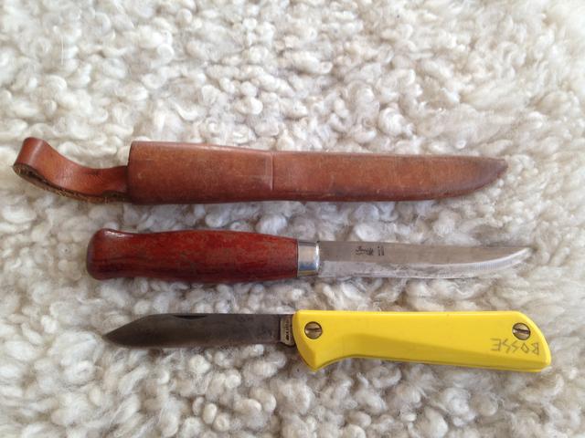 Två väldigt tidiga knivar. morakniven fick jag när jag var fem år gammal. Min farbror Edner kom med den till mig när jag lekte i sandhögen. Han sa att det var dags för mig att ha en kniv så jag kunde vara med och Jaga älg. En av de lyckliga stunderna i livet. fällkniven fick jag av Edner i julklapp ett par år senare. Har blivit att jag tänkt på det en del nu i höst eftersom Edner gått bort.