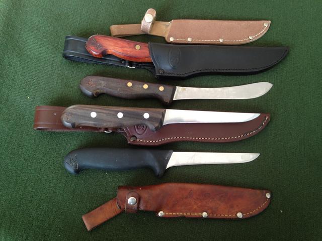 Kniven med träsliret visade jag även tidigare. Jag köpte den i trakterna av att vara 18 år. Den andra kniven fick jag av mina arbetskamrater på ett bygge i Vemdalsskalet efter att jag brännskadas. Inget allvarligt men jag behövde vara sjukskriven ett tag och fick denna uppmuntran.dessa två knivar är vad jag använde till älgjakt och det mesta annat i friluftsliv väg under 1980 och 1990 talen. på den tiden hade vi mycket älg. Några älgar sköt jag själv och det flesta sköts av andra sammanlagt lär det väl röra sig om en 200 till 300 älgar som man i olika grad använt dessa knivar till. numera dem i stortsätt pensionärer till förmån för mer speciella jaktknivar samtidigt som älgstammen sjunkit rätt dramatiskt .