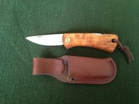 Kan jag få visa er en kniv som jag jobbat otroligt mycket med. En i grunden lysande design där eka tappat stilen totalt. Handtagets behandling var bedrövlig Men jag har använt olja och terpentin i ett par år så den börjar väl vara ok. Låset inpassning är egentligen bedrövlig men det fungerar och till råga på allt stack spetsen upp ovanför skaftet vilket gör att jag fått sänka spetsen. Även det sista är bra för funktionen men bedrövligt i tillverkningen. Härdningen är dock bra så det är numera en brukbar kniv.