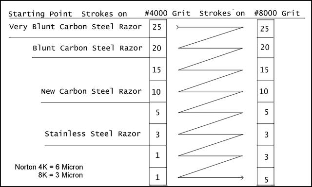 Antar att det är väldigt personligt. För mig är det tre stycken som löser det mesta. Om man inte skadat eggen så är min huvudsten en King 1200 för att sen gå på med en 3000 sten och och sen strigla. Eventuella skador rätas ut med en Dmt diamantsten 'grov' före jag går på med 1200 stenen.