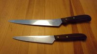 3. Jag kör som de flesta idag med den s k "rocking push cut". Därför är ett längre blad praktiskt. Till "lift cut" (japansk teknik) är ett kortare och mer välbalanserat blad att föredra. Lämpliga modeller till den här typen av arbeten är ju de så populära Santoku- och Nakiri-knivar.