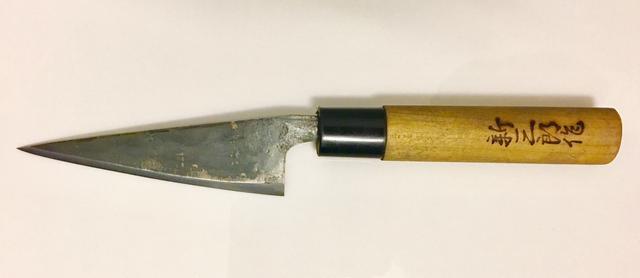 Kanske ointressant inlägg detta, men det är ju rätt härligt med ett flöde av bilder så jag lägger upp oavsett. Jag hade (ytterligare) en traditionell japansk kökskniv som jag inte riktigt blivit vän med. Bladformen var nakiri, dvs. en grönsakshackkniv. Är inte helt vän med den bladformen då den just kräver att man "hackar" som en yxa, därmed är eggen i princip rak både i avseendet utan buk och parallell med handtaget och då inte så bra för att skära med. Det jag inte har är en riktigt bra mindre urbeningskniv, så jag provade att fullständigt omprofilera bladet. Formen är nu fullständigt annorlunda (70% av bladet är nu slipdamm), men även slipfasen är (med hjälp av en slipfirma) helt ändrad från superbrant till mer hållbar givet hur hårt stålet ändå är. Stålet är ju knappast det mest ändamålsenliga för just urbening, men nu borde eggen klara sig utan urflisning tror jag. Den ser säkert "lite konstig ut" men har en ergonomi som för mig passar syftet perfekt, inklusive en nedåtlutande vinkel även på ovansidan av bladet där man kan lägga pekfingret för fullaste kontroll. Tja, som sagt, bara ett hobbyprojekt, det är nu bara jag som har exakt en sådan kniv så då var det värt orimliga mängder tid vid bandslipen och kylning om vartannat