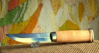 En mycket läcker kniv! Grattis, bra jobbat!Så här kan det gå när man gjort om greppet. Stannade på 400 korn. En omgång Kirjes oljevax på. Ska nog lägga på två till, mest för skyddets skull snarare än att jag tänker polera mer. Sen ska det sys en slida, dangler givetvis..