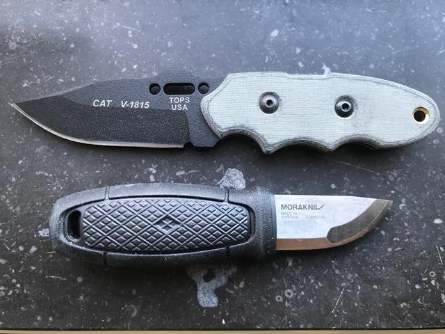 Storleksmässigt hamnar den väl i ungefär samma klass som Morakniv Eldris. Ganska kort handtag och kortare blad. TOPS CAT kan emellertid inte få gnistor ur ett eldstål (vilket Eldris är en mästare på) eftersom den har en ganska tjock svart beläggning på bladet.