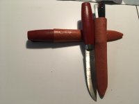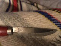 Lite mer info om knivarna. Så långt jag kan förstår ju bladen utav solitt kolstål. Det är åtminstonde inte laminerat och inte heller rostfritt vilket ju inte ger några alternativ. Bladryggarna är mycket skarpa i kanten och exempelvis lämpliga för Tändstål. Däremot tror jag inte att det är tanken eftersom nog inte eldstål var speciellt vanliga för 50 år sedan. Jag köpte dom här för att ha en finkniv i snickar/arbets/fiske/bärplockar fjällrävenbyxorna sommartid i fjällstugan. Den ligger i ödemark i princip och kniv i byxorna är en självklarhet. Funkar även på kaffeet nere vid sjön. Nu är det tveksamt om inte de är knivarna var lite för fina. Fast och andra sidan. Om jag lämnar dem obrukade intill min död kanske de hamnar på loppis och hamnar i någons garage. Jag har egentligen som filosofi att inte äga mer grejer än vad jag vill använda. Funkar på det mesta utom knivar. Där har jag åtminstone för många för att det ska funka på det viset.