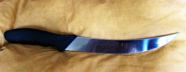 En urbeningskniv från svenska Primecut. Den har ett ergonomiskt gummerat Thermoplast-grepp och ett 210 mm långt blad i Sandvik 12C27.