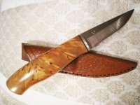 Har inte kunnat göra knivar på några år då jag inte längre har tillgång till en verkstad. Dom flesta har getts bort men jag har ett par kvar som jag använder ibland. Bla två stycken som säljaren påstod skulle vara i damast VG10. Är inte helt hundra på att så är fallet men stålet är iallafall såpass hårt att jag inte kunde borra i det.