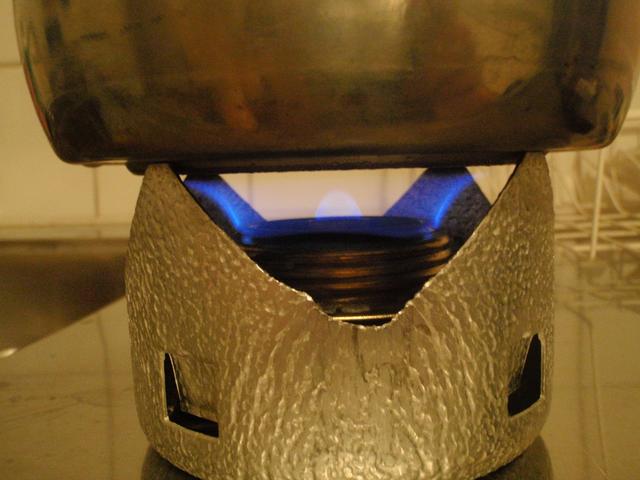 Titanbrännaren brinner utav bara helvete, mycket lågor slickar kanterna på kastrullen. En kastrull med bredare diameter kunde varit bättre. Värmer vattnet mycket snabbare men förbrukar också mer bränsle.