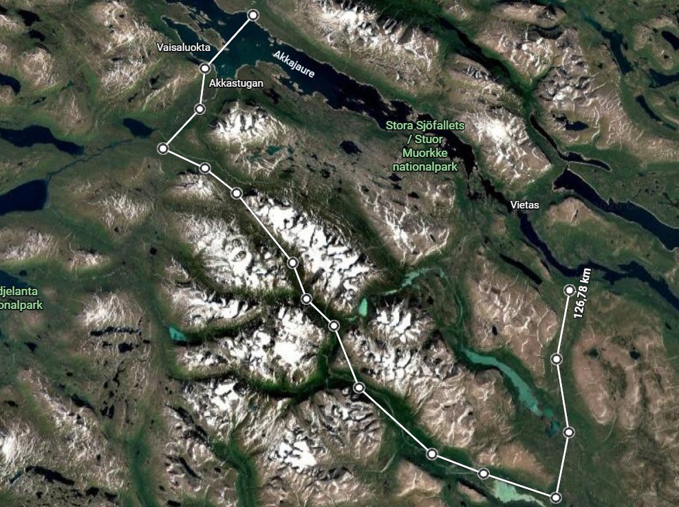 Vi tänkte vandra Ritsem, genom Sarek-rapadalen och avsluta i Saltoloukta enligt bild nedan.