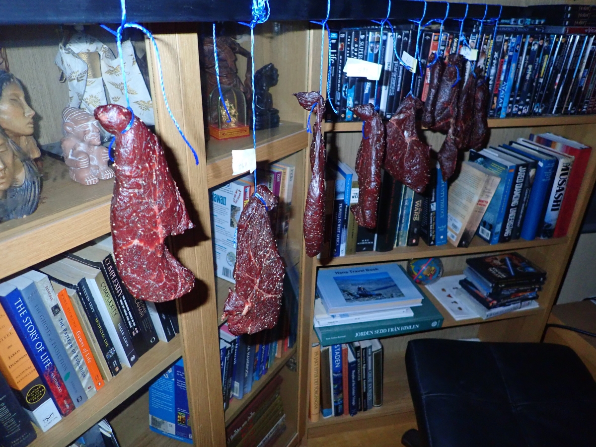 Dags att prova att lufttorka kött igen. Köpte lite rostbiff på Ica, skar upp i lagom bitar, torrsaltade 1.5 dygn, och hängde upp i vardagsrummet. Mums !!