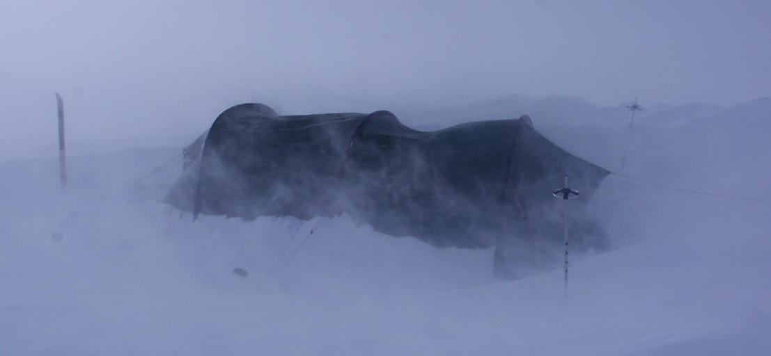 Jo, fint är det. Men helt orealistiskt, för i den riktiga naturen blir det inte alls så vindstabilt och välordnat. Här är ett foto från min vintertur 2016 då jag och min kompis Anders var inblåsta i 4 dygn nära Kebnekaise. Ett ordentligt spänt Keron-tält som stormbyarna fick att hoppa och skutta som en kalv på grönbete.