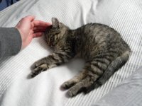 En vecka efter händelsen då jag hittade pengarna i diket, kom jag körande längs en ganska liten skogsväg. Fick syn på något som var på vägen, men fortsatte i samma hastighet, ca 70 km/h. När jag dundrar förbi det som är på vägen, ca en meter ifrån, ser jag att det är en kattunge. Jag tvärnitar och går efter den. 15 minuter senare hade jag fångat den lilla stackaren, mager och eländig var hon. Självklart kunde jag inte lämna henne kvar, så hon fick följa med. När vi kom hem vägde jag henne, 670 gram. En vecka senare vägde hon 1200 gram. Och då hittade jag två fästingar som hade börjat växa till sig, inte ens dom hade kunnat äta av henne tidigare, så mager var hon. Två veckor efter att jag hittat henne vägde hon 1400 gram. Troligtvis var hon 12 veckor när jag fann henne, normalvikten vid den åldern är ca 1200 g. Hankatten som jag hade sedan innan fräste åt henne i 8 dagar och lät henne inte komma närmre än 1 meter, 'Vaaaad är det du har släpat in i mitt hem?' tycktes han säga. Nu väger hittekatten närmare fem kilo, tjock och fet, men mycket söt =) På första bilden hade hon varit hos mig i några dagar. Den andra bilden är tagen för ca två månader sedan.