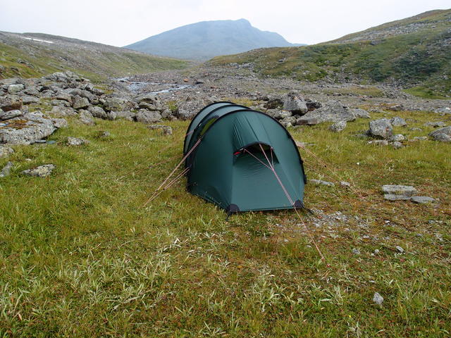 Bara ca 100-200 fr det utloppet finns den enda möjliga tältplatsen mellan Låptåvakkjavrre och Goabrekjavrasj vad vi kunde hitta, en liten grön hylla med plats för 2, max tre små tält. På bilden ser du sjön i 90graderskröken, och utloppet hitom den. Njoatsosvagge var fantastiskt, trots låga moln. Lycka till!