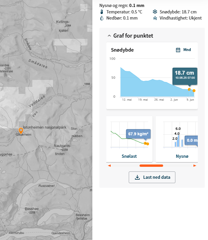 Okej, tack allihopa för er otroligt värdefulla input - den är obeskrivligt uppskattad! Vi har bestämt oss för att ta fram en ny rutt som skippar vägen till Glitterheim helt och hållet. Istället går rutten från Gjendesheim, "direkt" till Memurubu via vägen som går längs med Russvattnet. Då går vi nästan bara över bar mark :) Vi stöter förmodligen fortfarande på en del snö mellan Memurubu och Gjendesheim, men det är ju inget jämfört med vad vi hade gjort om vi körde på vår första rutt. Bifogar en bild nedan, det valda filtret är "Snödjup". Antar att vi fortfarande kommer behöva stegjärn, eller vad tror ni? Ingen av oss äger ett par nämligen, så vore gött att slippa köpa.
