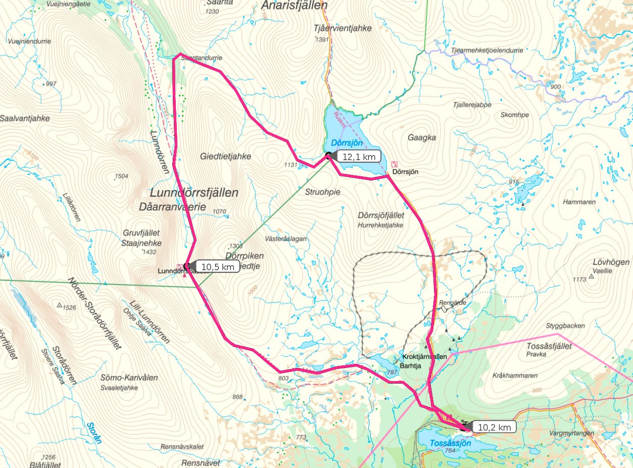 Jag tänkte vandra Tossåsen - Lunndörren - Dörrsjön - Tossåsen. Tältnatt i Lunndörren och vid Dörrsjön. Se bifogad bild.