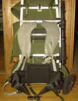 Här har du en bild av ryggsidan på min gröna 90-tals Alaska, som jag kompletterat med det tjockt stoppade 'modernare' höftbältet. Där finns inte en enda hård tryckpunkt som ligger an mot ryggen - där ryggen berörs är det överst ett (med vantskruv hårt spänt) nätband som knappt känns mot ryggen (om man inte knallar omkring helt naken) och som du ser är det nästan helt genomskinligt och väl ventilerande... Och nederst ser du den stoppade puta som ligger an mot svanken när höftbältet är (korrekt och lagom) åtdraget. [Vissa bälten har inte putan, då sitter det hela bara med det stoppade bältets egen yta.] Även höftbältet är hårt fastspänt mot ramen, för att säkerställa den ventilerande luftspalten mot ryggen...... Så det är väl en ramryggsäck som hjälper, men jag är inte sugen på en äldre modell.
