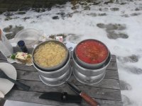 Gött med 2 flammor. Då kan man laga på riktigt. Hade bra värme 25-35 min och det var gott om sprit kvar i båda brännarna. Fyller dem högt.