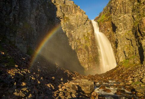 Det är inte ofta man kan se Sveriges högsta vattenfall i solljuset. Det händer bara ett par veckor kring midsommar.