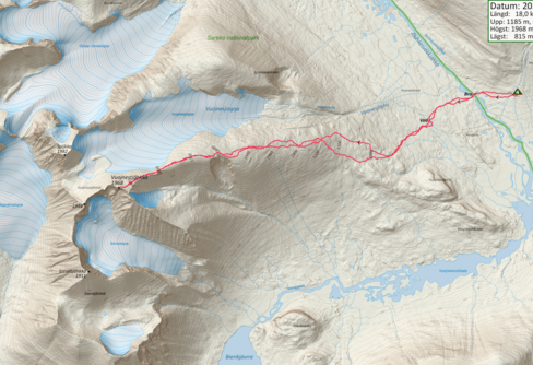 En augustivandring där jag planerat att från Surova vandra runt Sarektjåhkkåmassivet och göra ett antal toppturer. På grund av en plötsligt förändrad väderbild fick jag nöja mig toppturer till Skanátjåhkkå och Vuojnestjåhkkå, och därefter återvända till Suorva i förtid.
