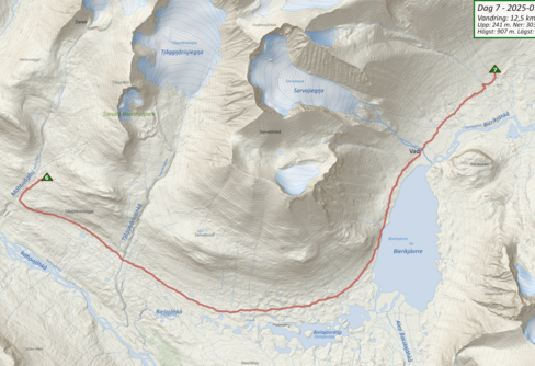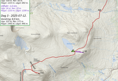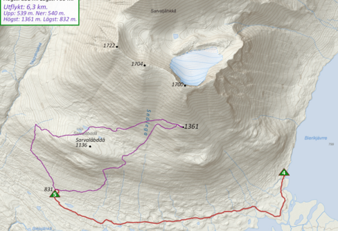Passerar de tre sista stora jokkarna i Guhkesvágge och fortsätter förbi Tjievratjåhkkå och genom Vuosskelvágge tillbaka till Suorva. Uppförsbackarna ...